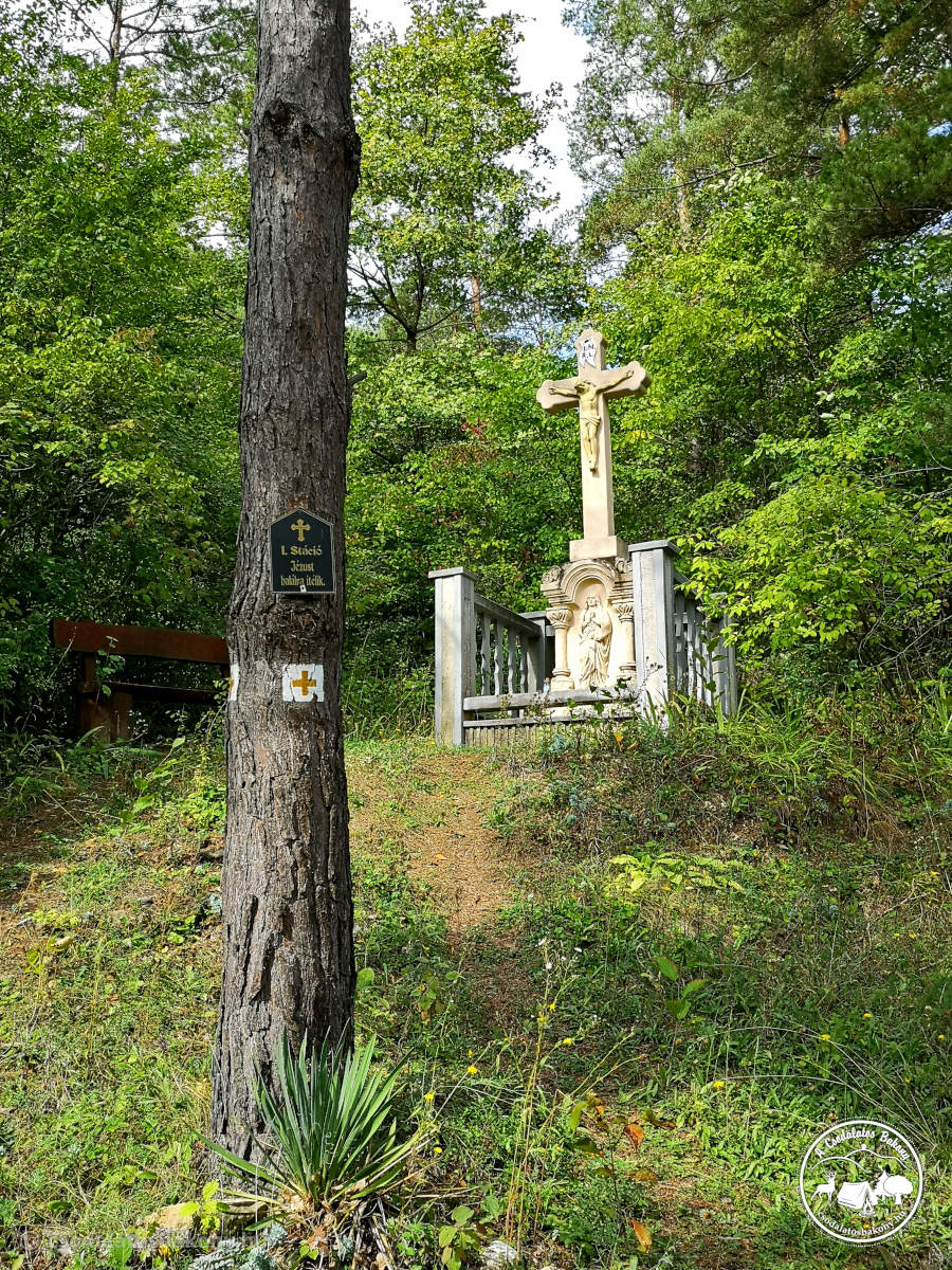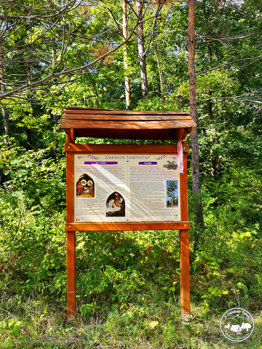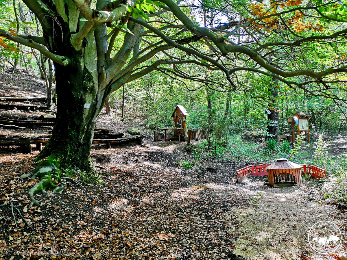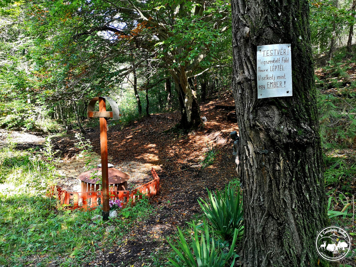 Innen az ˝Életfa˝ szakrális tanösvényen haladtam tovább, amely egybeesik a Sárga kereszt jelzéssel és amely Mária hét örömét, valamint a fák gyógyító hatását mutatja be. A tanösvény végállomása a Magyarpolányi Szentkút. A legenda szerint egy vadászt itt, a Szentkútnál szállt meg az ördög. Már épp halálán volt, amikor a Szűzanya megszabadította a szenvedéseitől és kiűzte belőle az ördögöt.